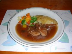 豚のヒレ肉にグリーンとピンクのペッパーの入ったクリームソース。